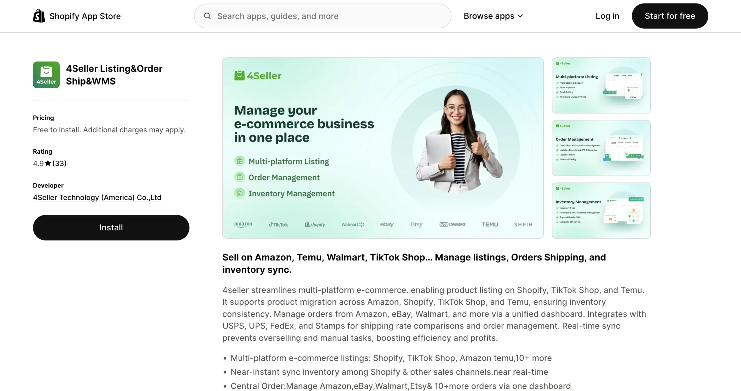 | 4Seller Listing&Order Ship&WMS | Kleine bis mittelgroße Händler, die eine einfache Automatisierung wünschen | – Lagerbestand- und Auftragssynchronisierung – Massen-Uploads und SKU-Zuordnung – Integrierte Versandetiketten und Sendungsverfolgung – Zentralisierte Aufträge | Temu, Amazon, eBay, TikTok Shop | Kostenlos zu installieren |