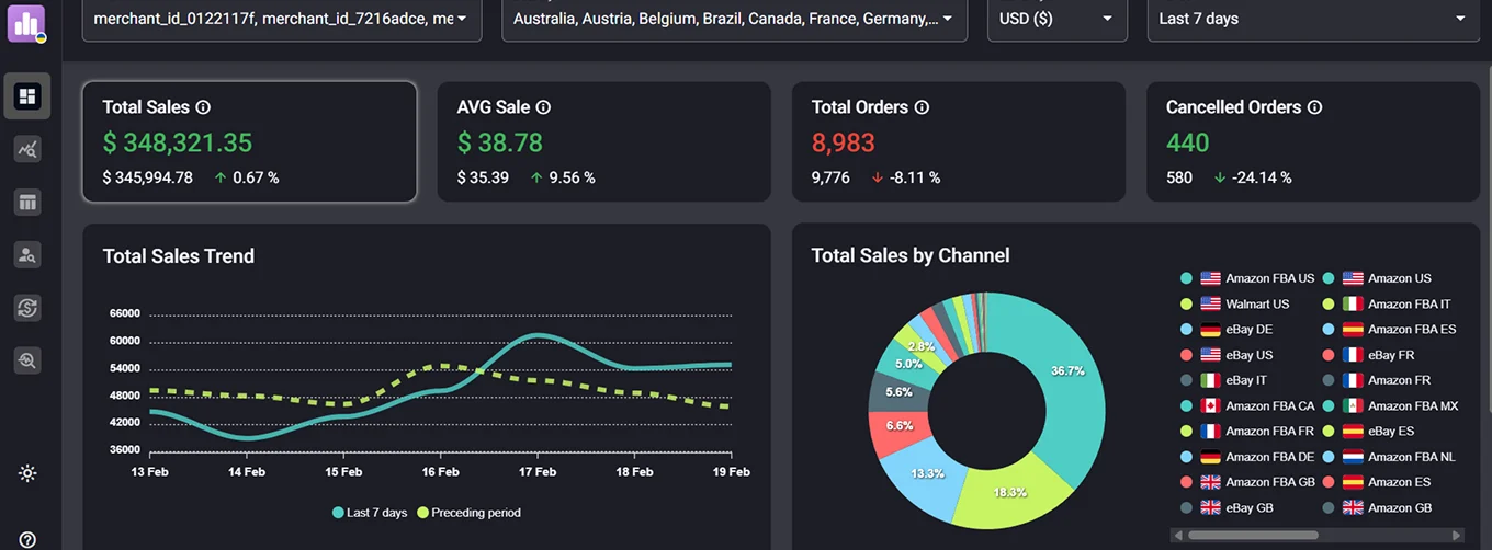 • Finanzielle Dashboards. Verfolgen Sie Gewinne, Verkaufstrends, Erstattungen, Gebühren und Kostenaufschlüsselungen auf Produkt- und Kontoebene. Händler können Standard-COGS festlegen, den ROI pro SKU überwachen und historische Daten für Prognosen und Planung anzeigen.