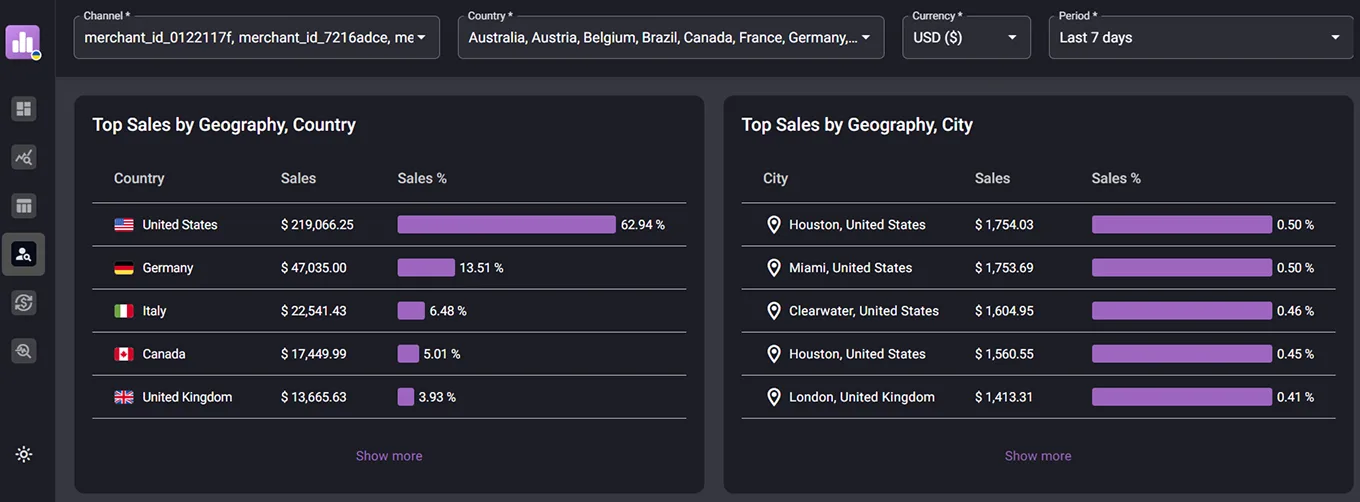 • Geografische und Channel-Gruppierung. Gruppieren Sie die Verkäufe nach Land, Markt oder sogar Stadt, um festzustellen, wo Sie an Zugkraft gewinnen und wo Sie optimieren müssen. Alles an einem Ort – Sie müssen nicht mehrere Dashboards miteinander vergleichen.