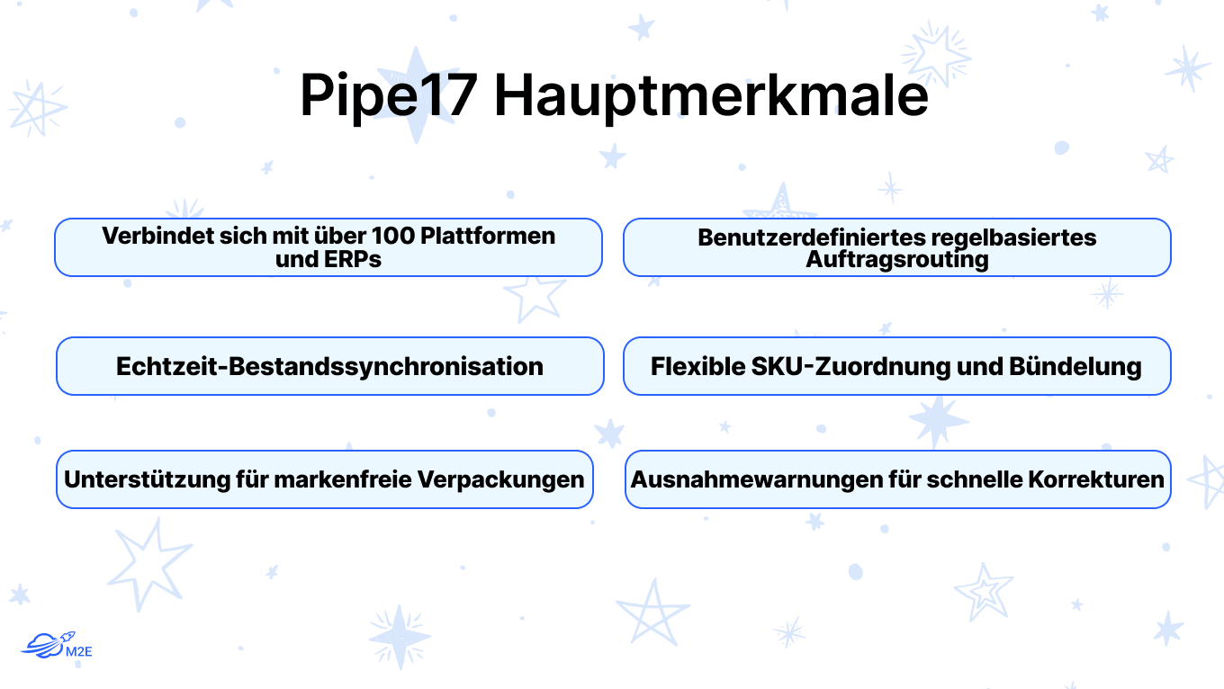 Pipe17 ist eine robuste Plattform für die Auftragsabwicklung, die sich nahtlos in Amazon Multi-Channel Fulfillment (MCF) integriert und es E-Commerce-Unternehmen ermöglicht, ihre Auftragsabwicklungsprozesse über verschiedene Vertriebskanäle hinweg zu automatisieren und zu optimieren.