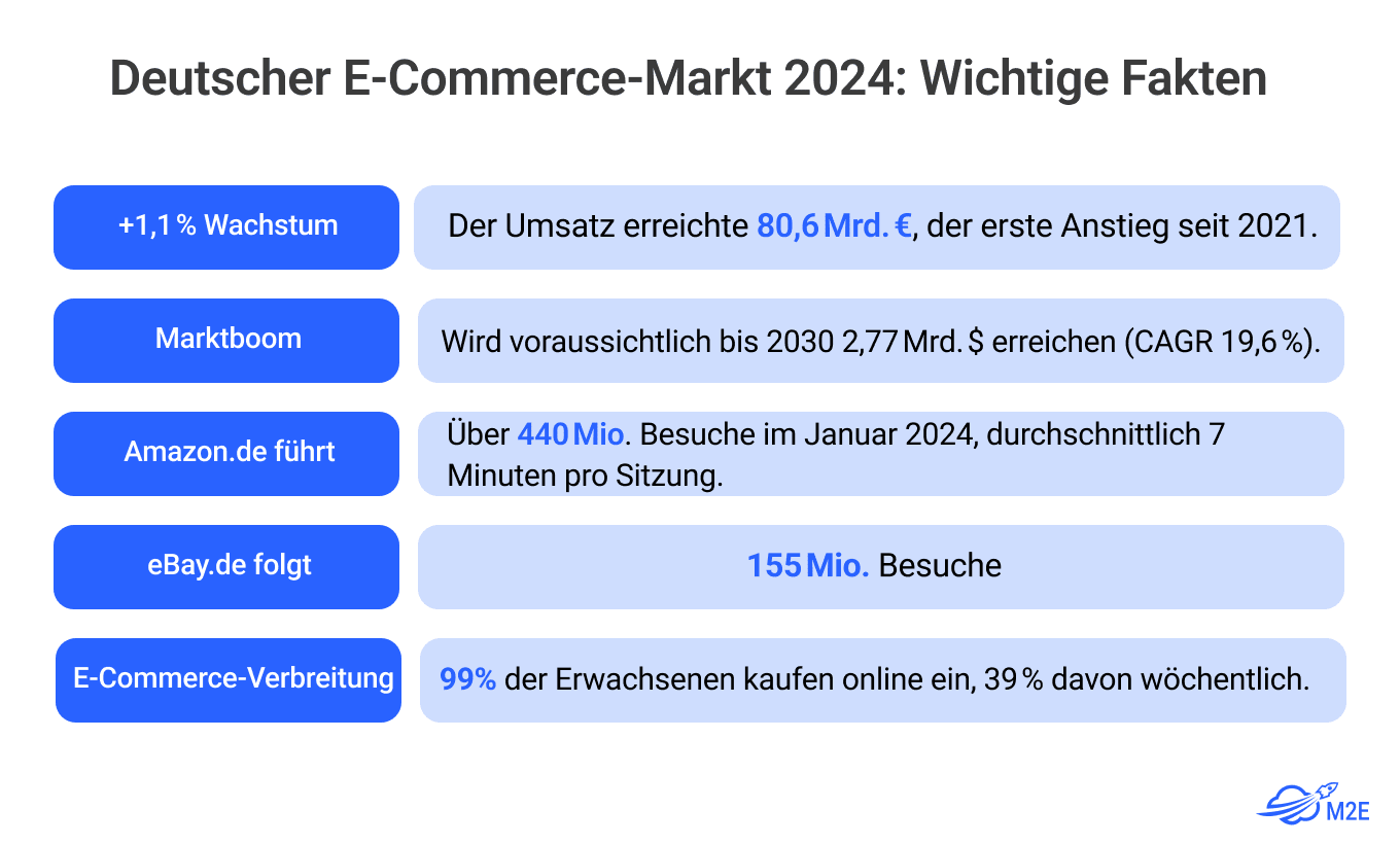 IIm Jahr 2024 verzeichnete der deutsche E-Commerce-Markt einen Umsatzanstieg von 1,1% und erreichte 80,6€ Milliarden — das erste Wachstum seit 2021. Dieser Aufwärtstrend deckt sich mit den breiteren Marktprognosen, da Grand View Research berichtet, dass der Sektor im Jahr 2023 einen Umsatz von 792,6$ Millionen erwirtschaftete und bis 2030 ein deutliches Wachstum auf 2.767,8$ Millionen erwartet wird, mit einer CAGR von 19,6% von 2024 bis 2030.