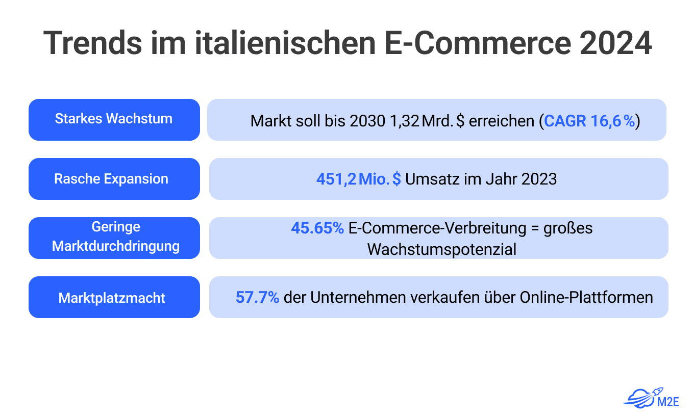 Italiens E-Commerce-Markt befindet sich auf einem starken Wachstumspfad. Es wird erwartet, dass der Umsatz bis 2030 1.319,6$ Millionen erreichen wird, was einer CAGR von 16,6 % zwischen 2024 und 2030 entspricht. Im Jahr 2023 erwirtschaftete der Markt 451,2$ Millionen, was sein schnelles Wachstum verdeutlicht.