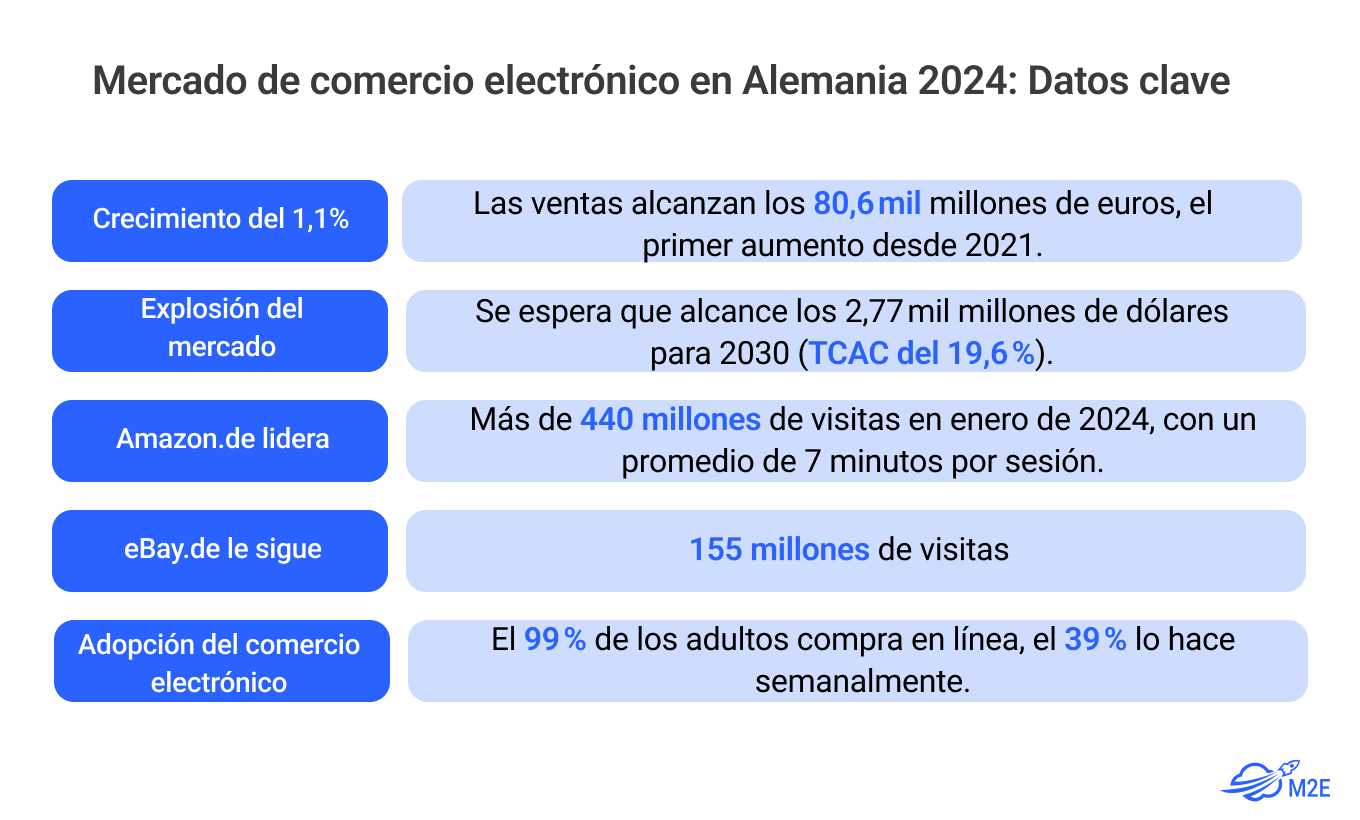 Un factor clave de este crecimiento es el dominio de los principales marketplaces, en particular Amazon.de. En enero de 2024, la plataforma atrajo más de 440 millones de visitas, con usuarios que pasaron una media de casi siete minutos por sesión. eBay.de es la segunda plataforma más popular, registrando 155 millones de visitas.