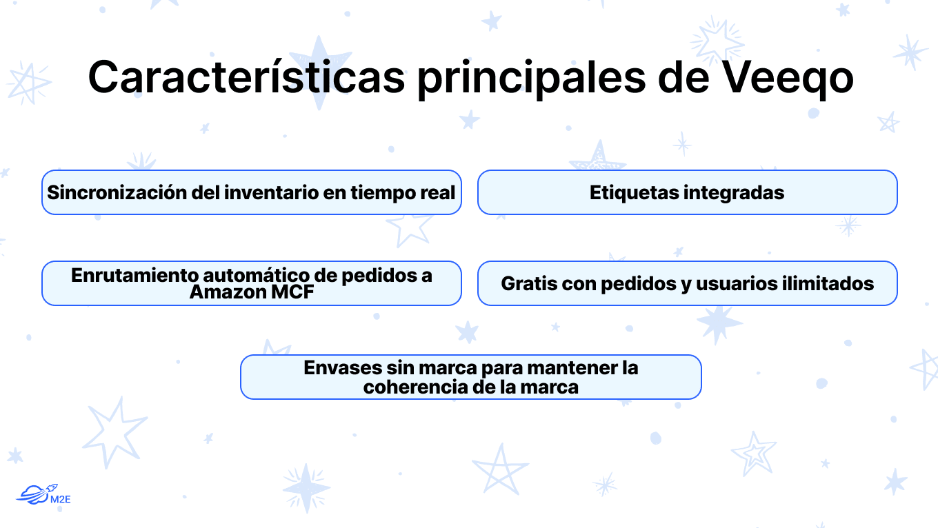 Veeqo es una herramienta gratuita de gestión de inventario y envíos propiedad de Amazon, creada para ayudar a los vendedores a simplificar el cumplimiento de pedidos multicanal. Se conecta directamente con Amazon MCF, lo que le permite gestionar pedidos de plataformas como Shopify, eBay y Walmart en un solo lugar. Cuando llega un Pedido, Veeqo lo enruta a Amazon para un cumplimiento rápido y fiable y actualiza a tus clientes con detalles de seguimiento.