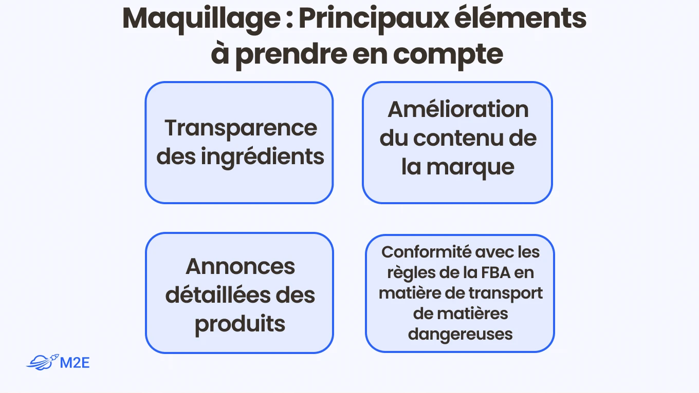 Conformité avec les règles FBA relatives aux matières dangereuses. De nombreux produits de maquillage, en particulier les sprays, les brumes ou les dissolvants à base d’alcool, peuvent être classés comme matières dangereuses par Amazon. Ces produits requièrent :