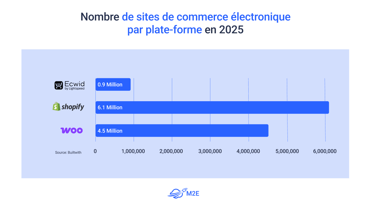 Environ 6,1 millions de boutiques Shopify représentent 26 % de l’ensemble des sites de commerce électronique dans le monde. On compte également 4,5 millions de boutiques WooCommerce (14 %) et plus de 900 000 boutiques Ecwid (4 %).(Builtwith).