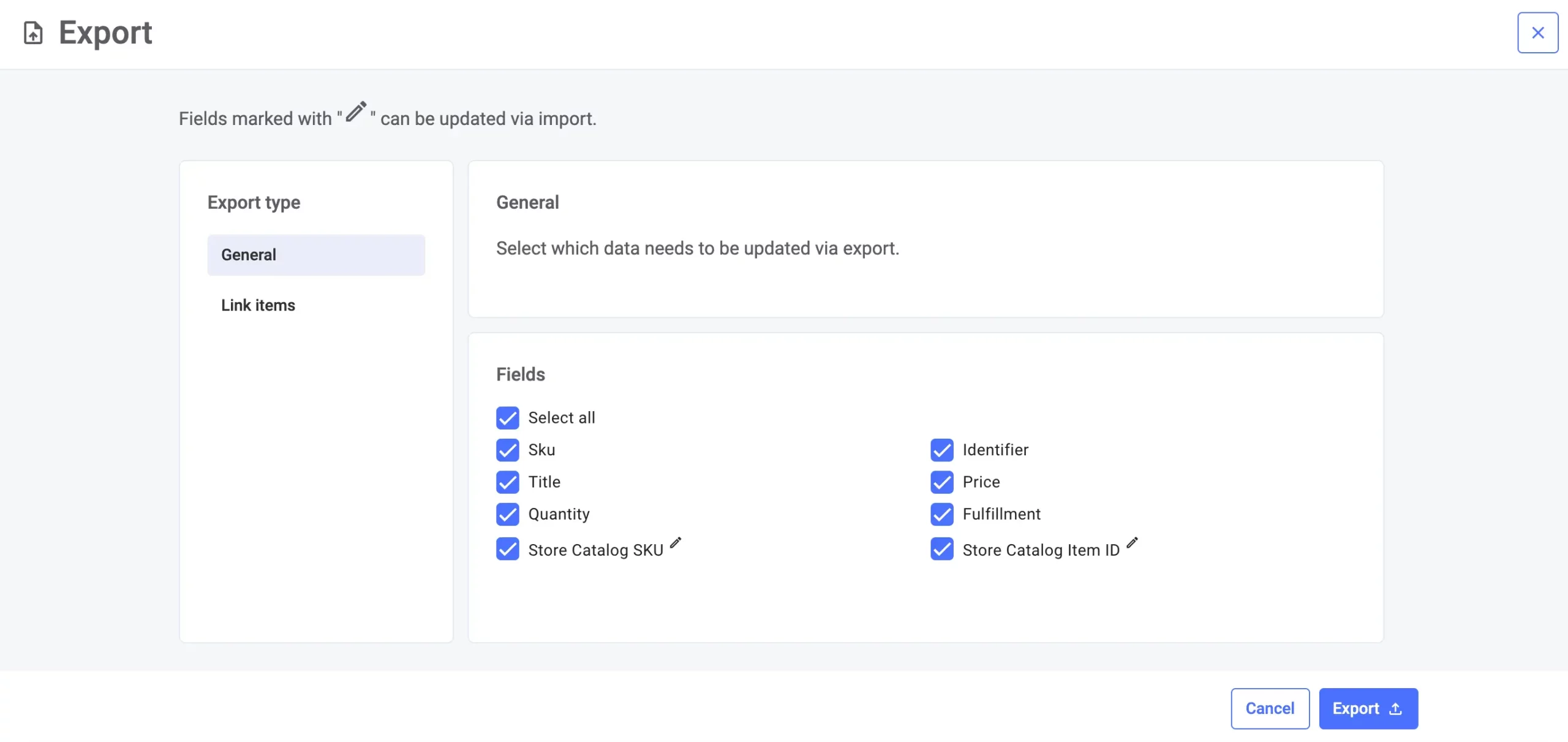W wyskakującym okienku przejdź do zakładki Link items. Upewnij się, że wszystkie odpowiednie pola są zaznaczone i kliknij Eksportuj.