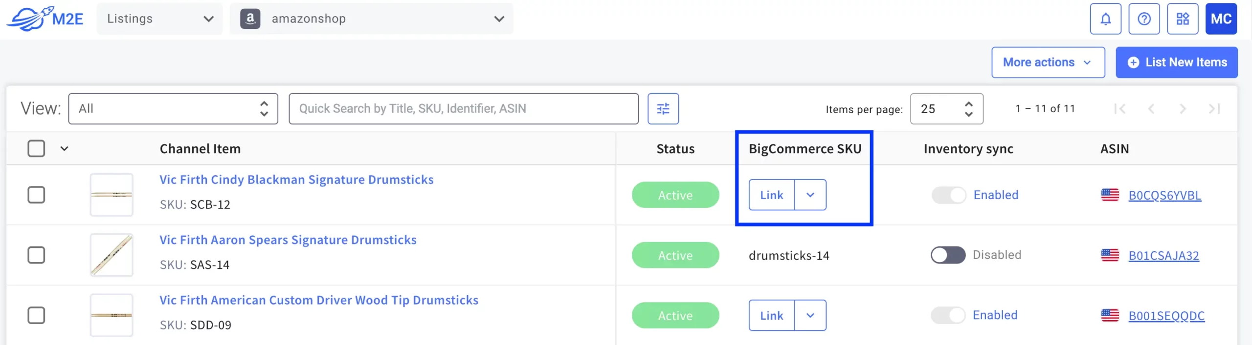 Następnie musisz połączyć swoje zapasy na obu platformach. Łączenie pomaga przygotować produkty do synchronizacji i zapewnić, że produkty zamówione w Amazon są zawsze powiązane z odpowiednimi pozycjami w sklepie BigCommerce.