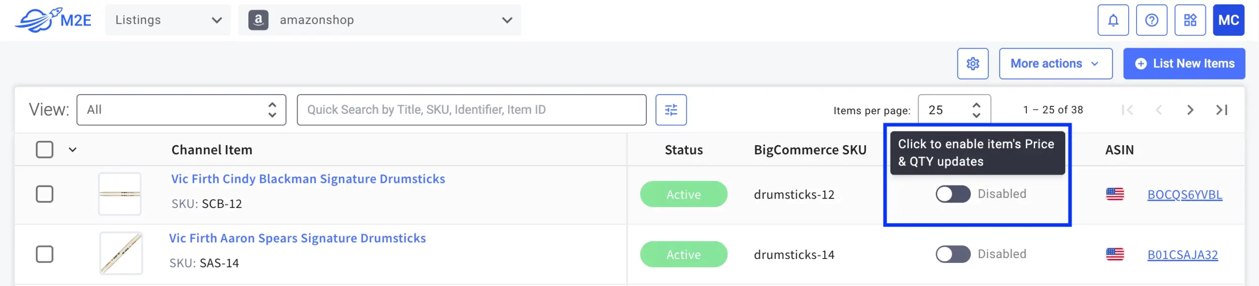 Po zsynchronizowaniu zapasów możesz rozpocząć sprzedaż produktów BigCommerce, które nie są jeszcze wymienione na Amazon. Kliknij przycisk List New Items w prawym górnym rogu i postępuj zgodnie z naszym samouczkiem, aby utworzyć nowe oferty Amazon.