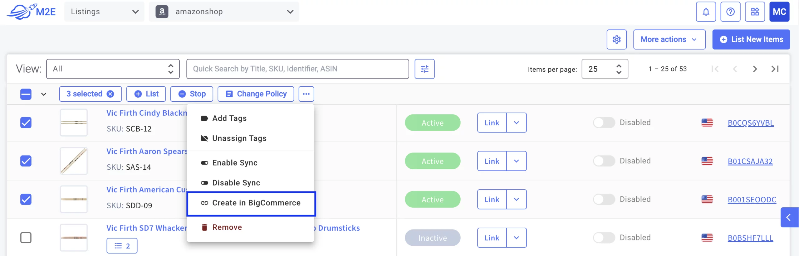 M2E Multichannel Connect umożliwia tworzenie produktów w sklepie BigCommerce na podstawie istniejących ofert Amazon. Jest to idealna opcja w przypadku, gdy nie chcesz zajmować się plikami CSV i zamiast tego zdecydujesz się na ręczne tworzenie produktów. Jeśli wolisz importować produkty z Amazon do BigCommerce za pomocą pliku CSV, przejdź do metody 2.