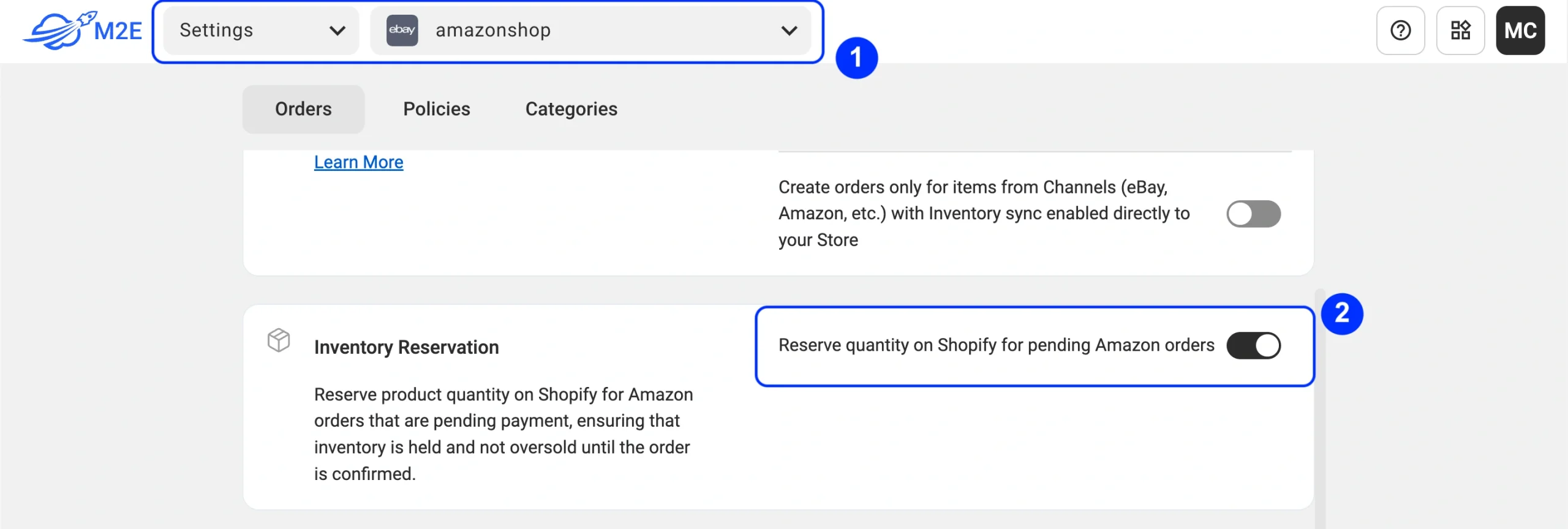 In addition to Amazon, M2E Multichannel Connect supports Shopify inventory reservation across other marketplaces, following the same streamlined process: